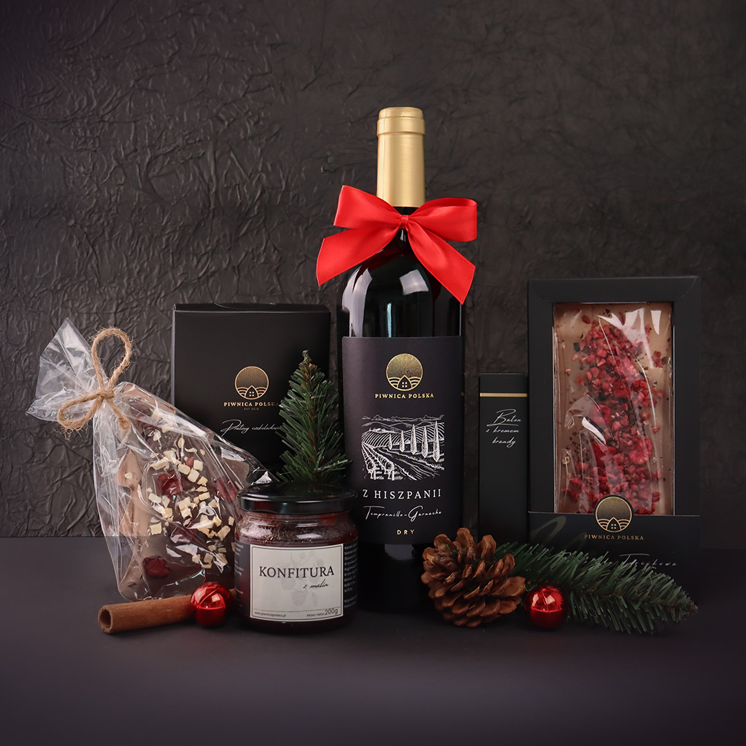 Zestaw zachwyca bogactwem smaków i kolorów, a obecność wina sprawia, że prezent nabiera wyjątkowego charakteru. To idealny wybór na świąteczne prezenty dla klientów, partnerów biznesowych lub pracowników.