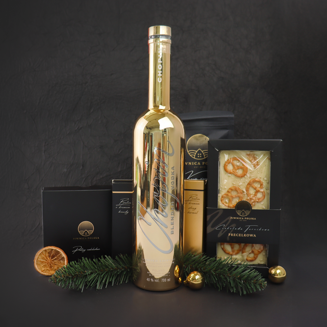 Zestaw upominkowy Świąteczny Chopin to elegancka i dopracowana propozycja na Boże Narodzenie 2025, stworzona z myślą o odbiorcach ceniących prestiż, jakość i wyjątkowy smak. W centrum zestawu znajduje się wódka Chopin Blended Gold – wyjątkowy produkt polskiej destylarni, który łączy szlachetne nuty ziemniaczanej wódki z delikatną, dębową złożonością.