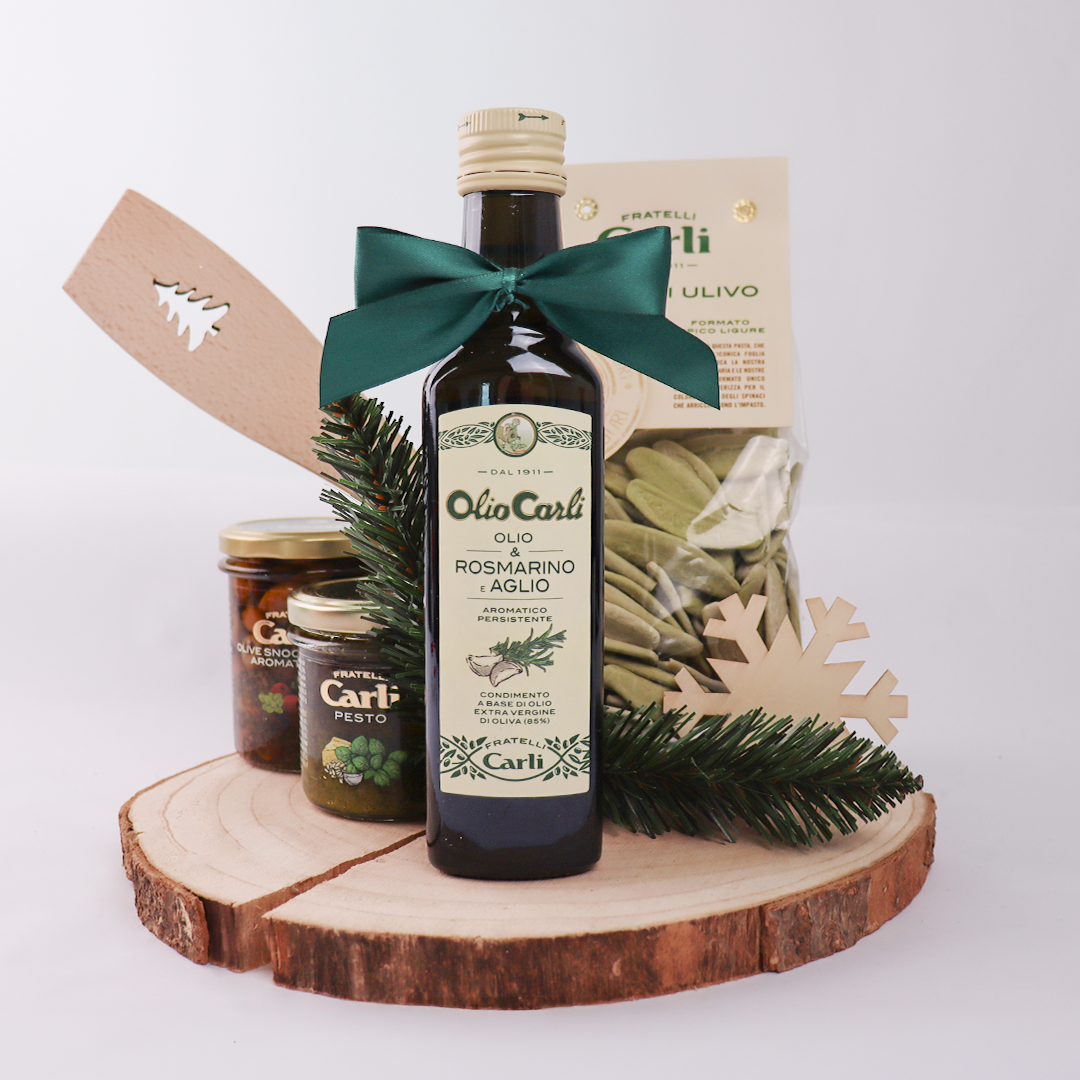 Zestaw zawiera makaron Foglie di Ulivo – oryginalne „listki oliwne” z pszenicy durum, oliwę z oliwek z rozmarynem i czosnkiem, klasyczne zielone pesto alla genovese oraz oliwki bez pestek w oliwie z ziołami. Dopełnieniem kompozycji jest drewniana łopatka, która czyni zestaw kompletnym i gotowym do świątecznego gotowania.