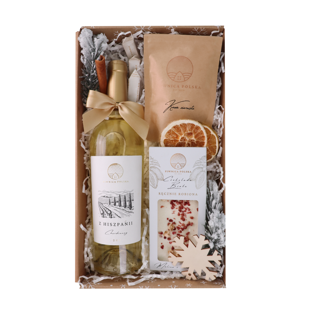 Zestaw upominkowy Zimowe Wino to lekka, aromatyczna propozycja na Boże Narodzenie 2025, idealna dla miłośników delikatnych smaków i spokojnych, zimowych wieczorów. W centrum znajduje się hiszpańskie wino Chardonnay – białe, owocowe, z subtelną kwasowością i eleganckim charakterem.